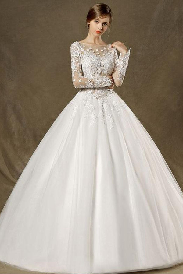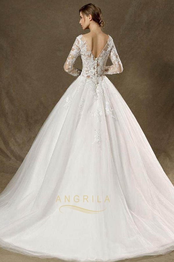 Ball-Gown Chapel Train Scoop Neck Lace Wedding Dress with Long Sleeves