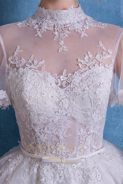 Ball-Gown High Neck Cathedral Train Lace Wedding Dress with Lace Appliques