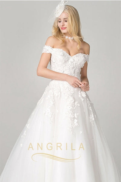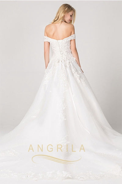 Ball-Gown Off-the-Shoulder Chapel Train Lace Wedding Dress with Lace Appliques