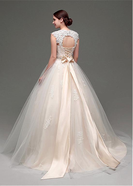 Silhouette: Princess, A-LineHemline / Train: Sweep / Brush TrainNeckline: Off ShoulderFabric: Tulle, LaceClosure: Zipper UPSleeve Length: Long SleeveWaistline: NaturalFully Lined: YesEmbellishment: AppliquesBuilt-In Bra: YesBoning: YesWedding Venues: ChurchTips: Professional dry cleaner only, Colors may vary slightly due to different monitor settingsTheme: Luxurious, RomanticWrap: No