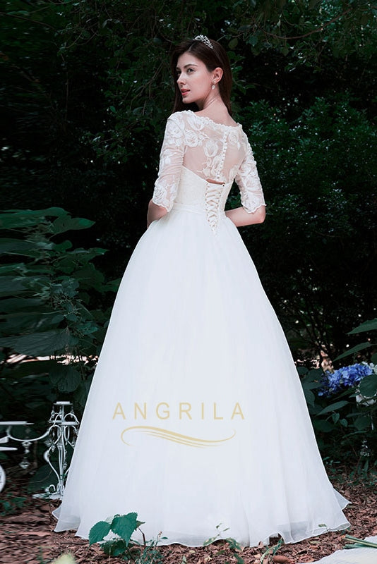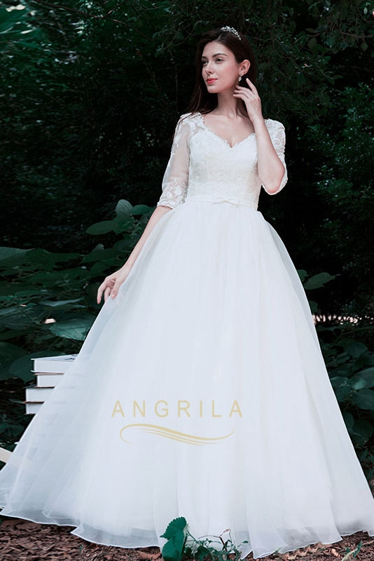 Ball-Gown V-neck Lace Wedding Dress with 1/2 Sleeves