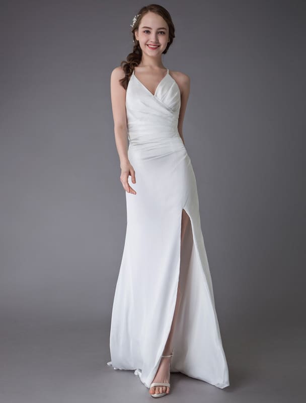 Women’s Long Satin Prom Dresses Spaghetti Straps Bridesmaid Dresses Formal Dress Ball Gowns with Slit - White