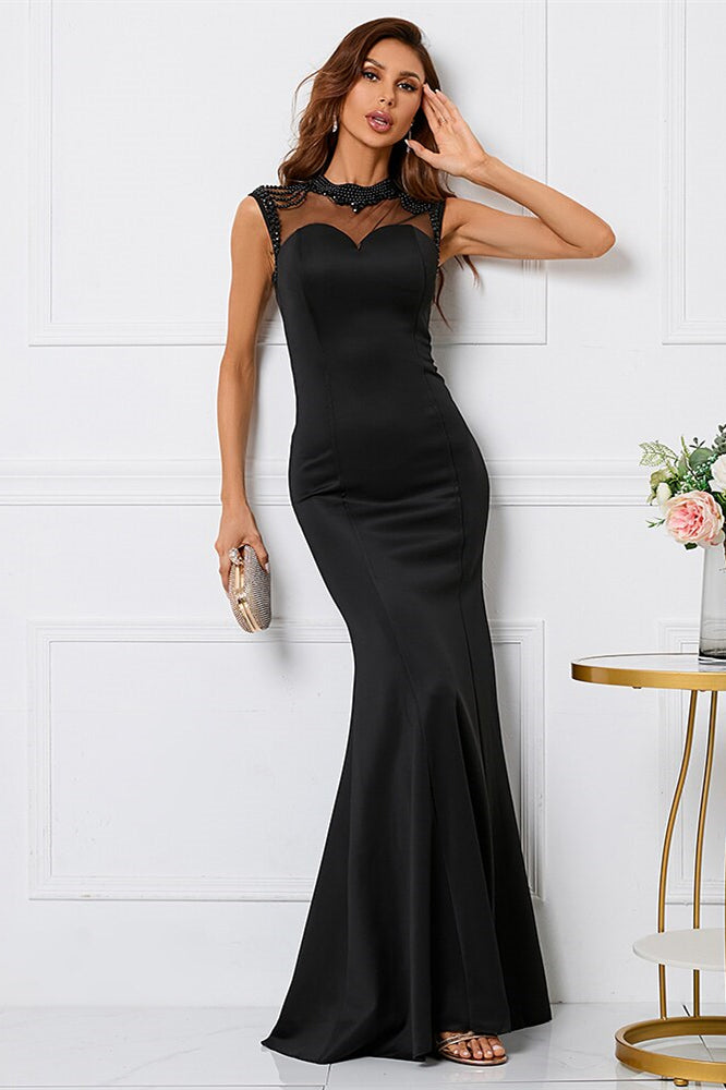 Beaded High Collar Mermaid Sleeveless Evening Dress - Black