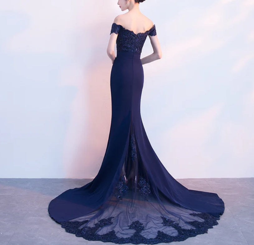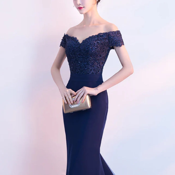 Beautiful Navy Blue Mermaid Lace Long Party Dress Off Shoulder Evening Dress