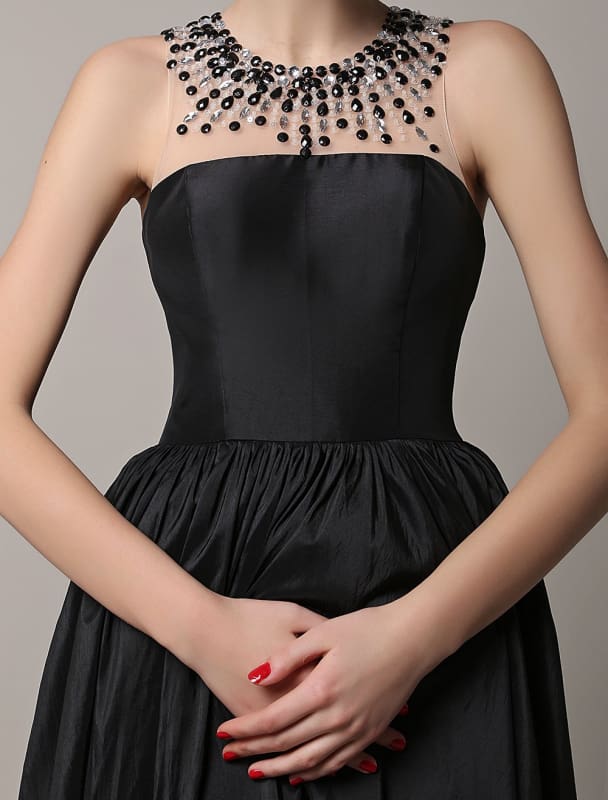 Black Prom Dresses 2021 Long Wedding Dress High Low Beading Illusion Neckline Taffeta Evening Dress Wedding Guest Dress Milanoo