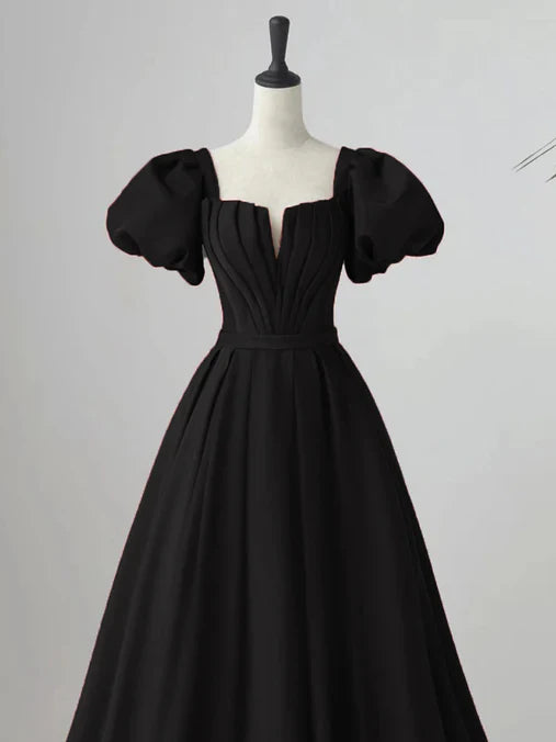 Black Satin Puffy Sleeves Long Evening Party Dress Long Prom Dress