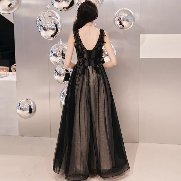 Black V-neckline Tulle Lace Applique Long Party Dress Prom Dresses Evening Dresses