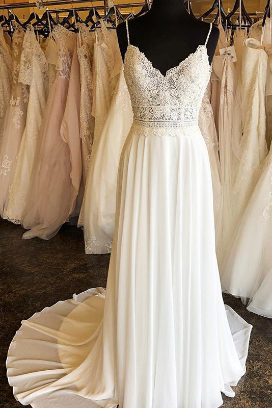 Boho sheath a-line long ivory wedding dress with v neck, spaghetti straps and lace top.