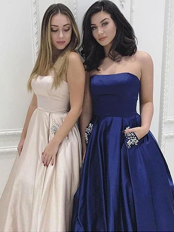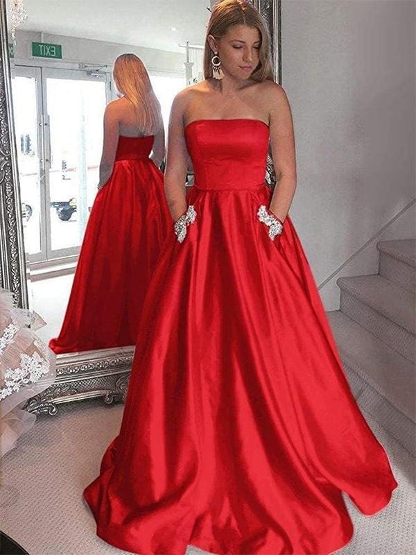 Strapless Beading Satin Evening Party Dresses With Pockets