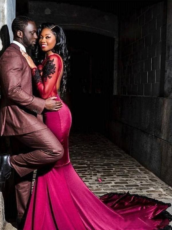 Mermaid Long Sleeves Bateau Court Train With Applique Satin Dresses