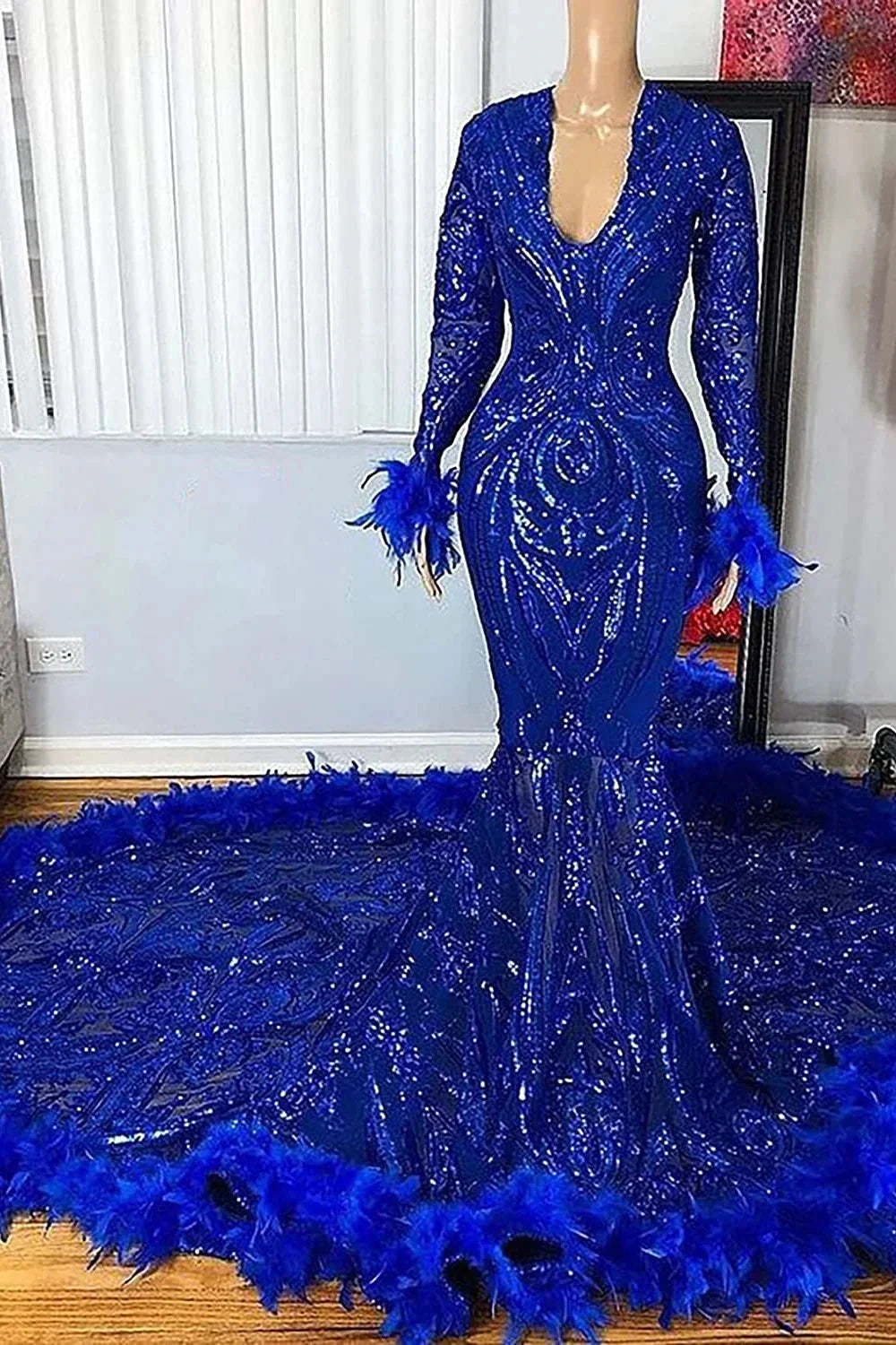 Budget Royal Blue Long Sleeves Evening Gowns Mermaid Sequins With Feather