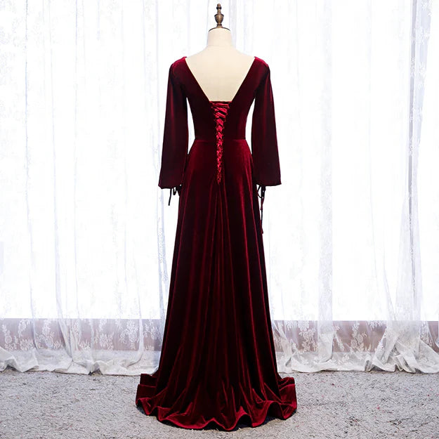Burgundy Velvet Long Sleeves A-line Prom Dress Long Simple Bridesmaid Dresses