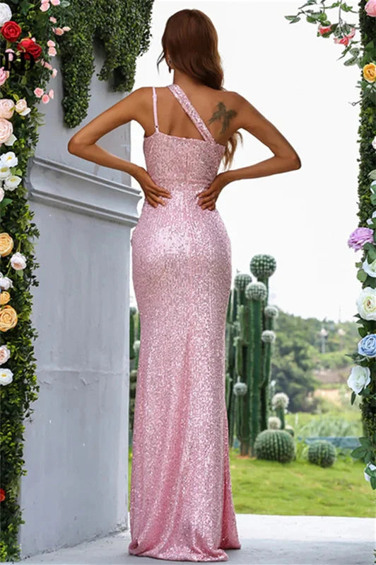 Chic Pink One Shoulder Mermaid Evening Dress Sequins Slit