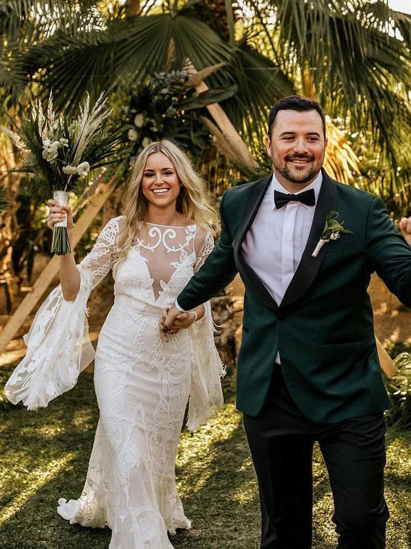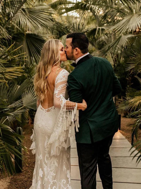 Chic Tassels Long Sleeves Illusion Backless Lace Wedding Dresses