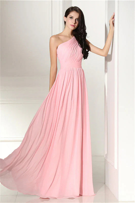 Chiffon Pink One Shoulder Long Bridesmaid Dresses