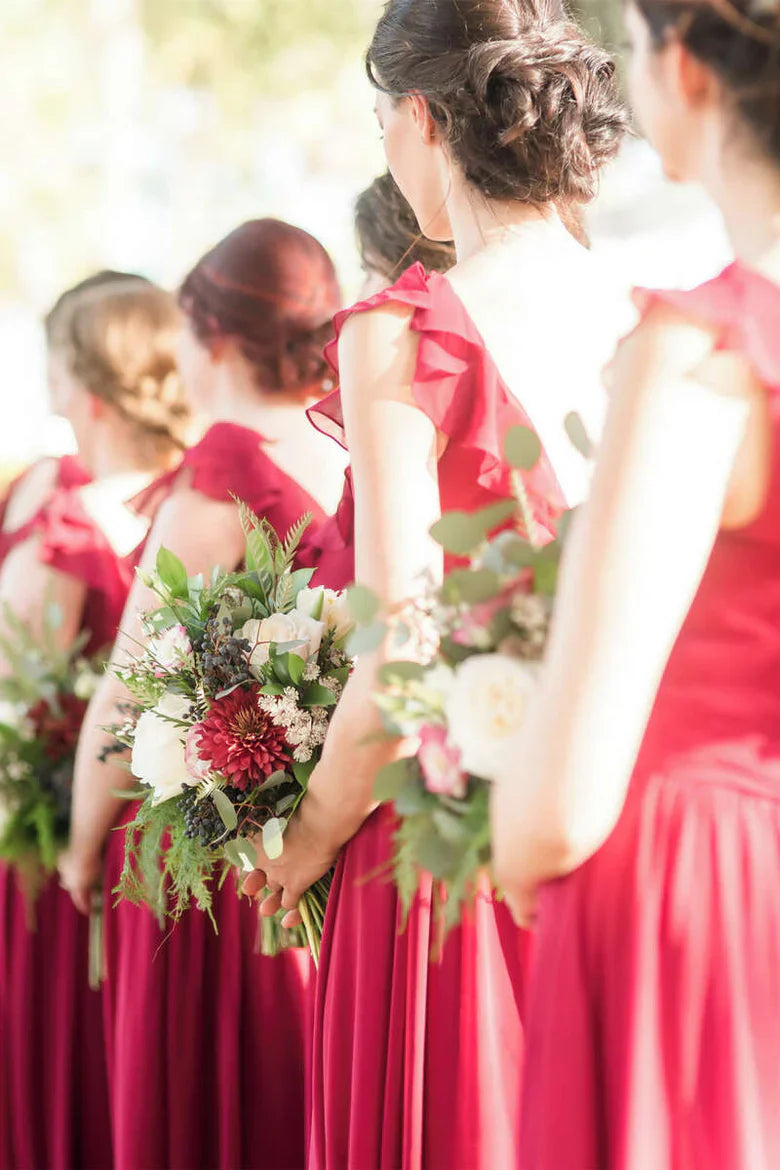 V Neck Floor Length Chiffon Ruffled Straps Long Bridesmaid Dress