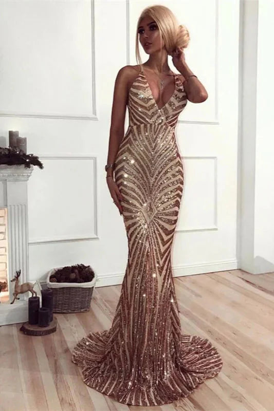 Classic V-Neck Spaghetti-Straps Sequined Mermaid Evening Dress Long