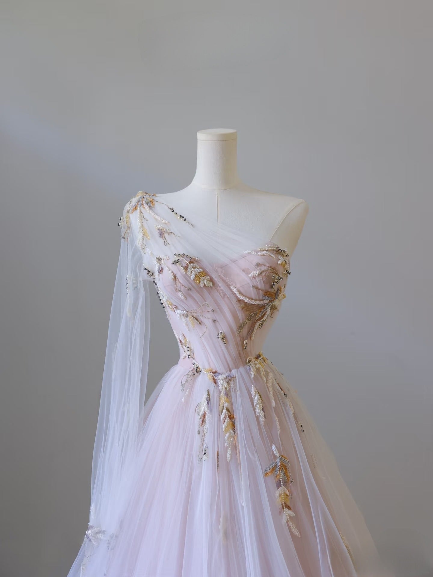 Classy A line One Shoulder Tulle Lace Long Evening Dress Prom Dresses SD2486