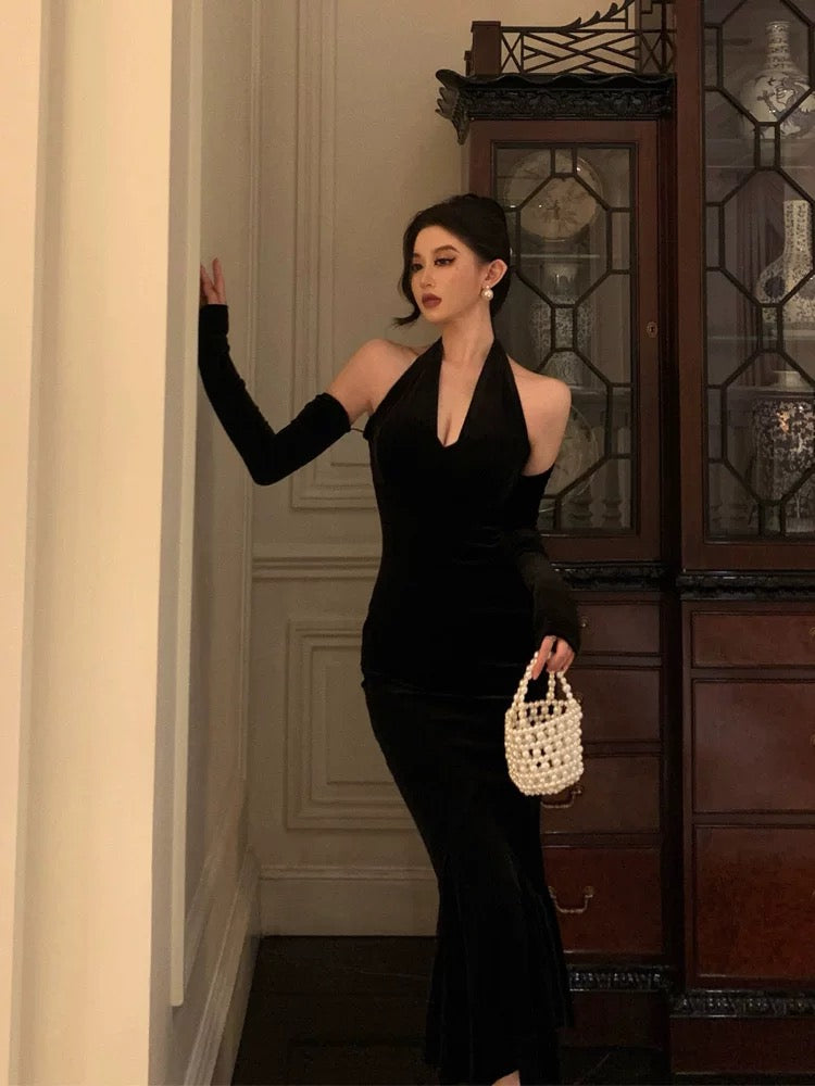 Classy Mermaid Halter Neckline Ruffles Black Velvet Prom Dresses Birthday Outfits Evening Gown SD897