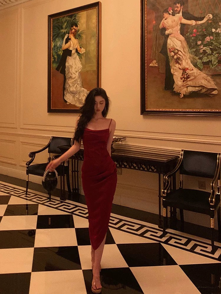 Occasion: Wedding Guest, Formal EveningStyle: Minimalist, VintageSilhouette: Sheath / ColumnHemline / Train: Floor LengthNeckline: V NeckFabric: VelvetClosure: Zipper UPSleeve Length: Long SleeveEmbellishment: Split, DrapingBuilt-In Bra: YesBoning: YesTips: Colors may vary slightly due to different monitor settings, Hand Wash Only