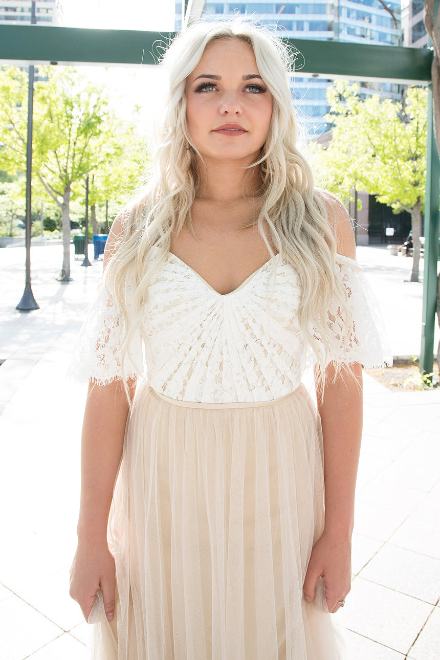 Long a-line wedding dress, white and beige wedding dress with cold sleeves.