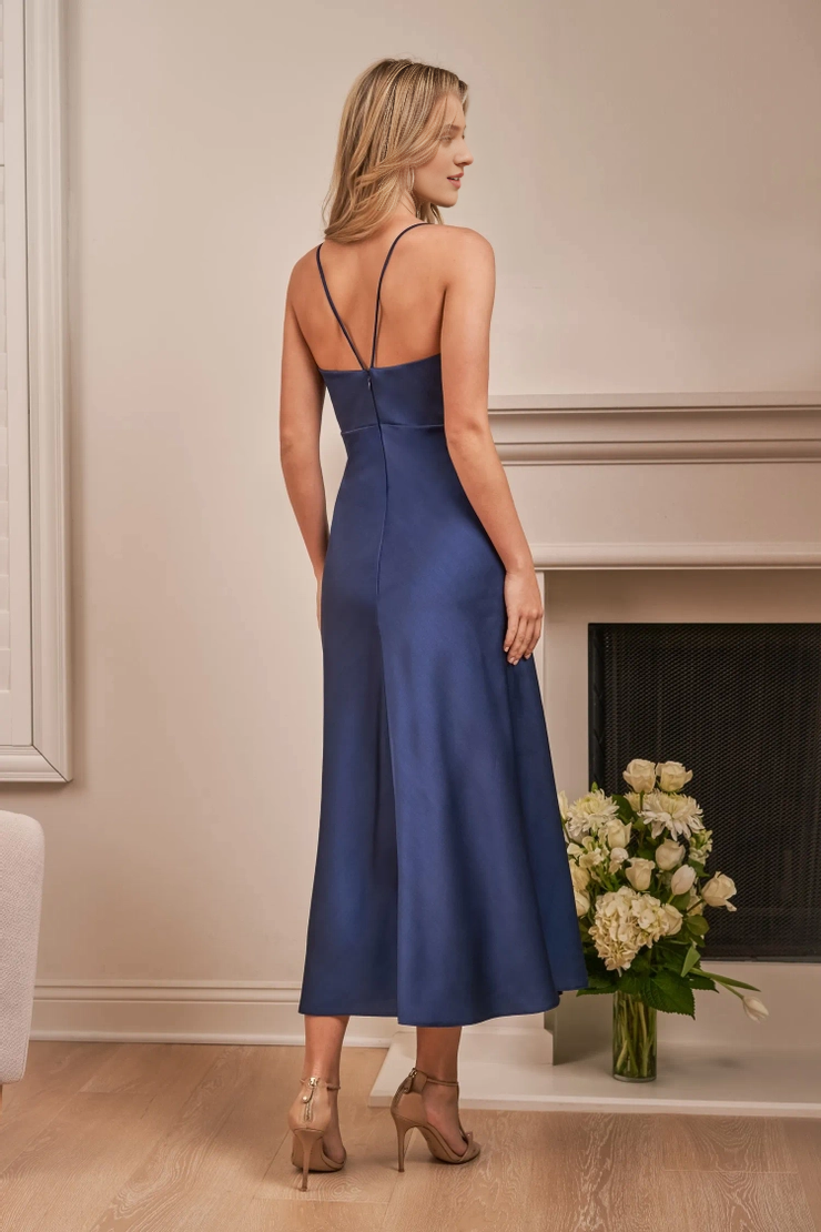 Crepe back slim fit trumpet shaped thin shoulder strap V-neck medium length bridesmaid dress