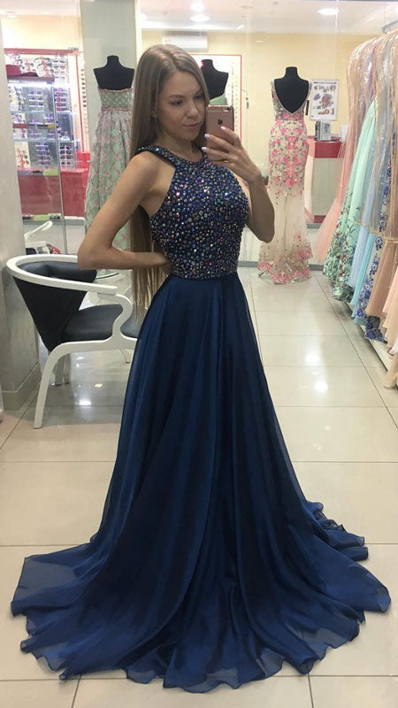 Dark blue beads chiffon A-line long prom dress, blue evening dress