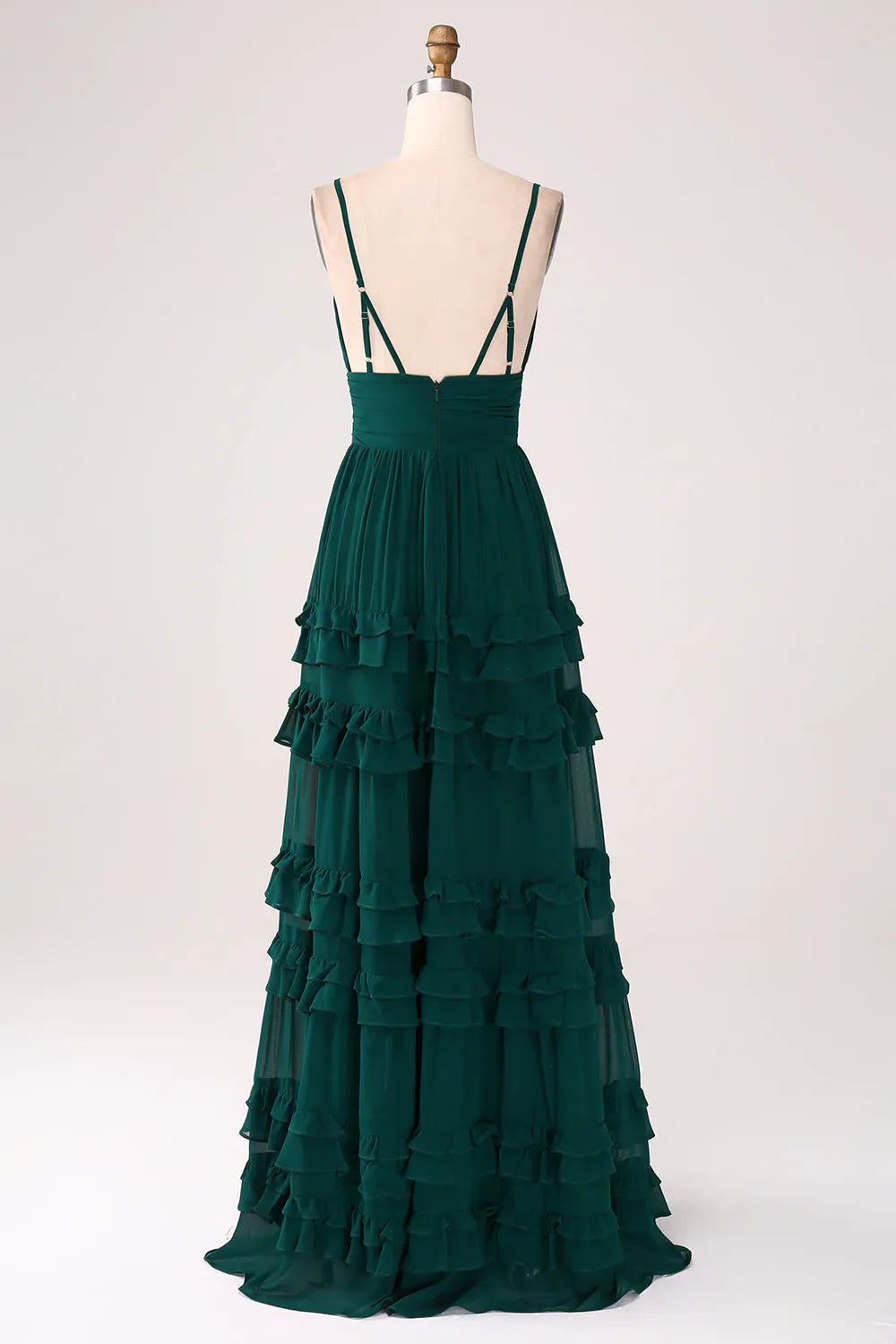 Deep green A-line thin shoulder strap layered pleated and floor length bridesmaid dress