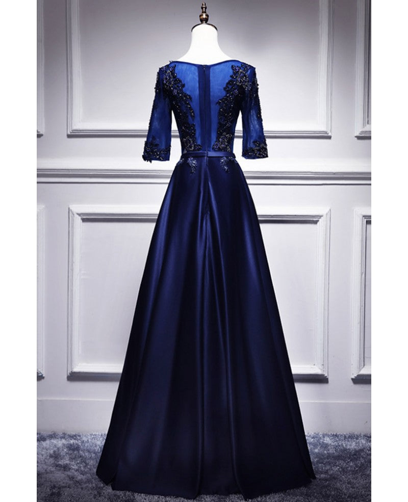 Elegant and noble blue short sleeved lace decal ball dress with blue V-neck satin and beaded back zipper and floor length evening dress