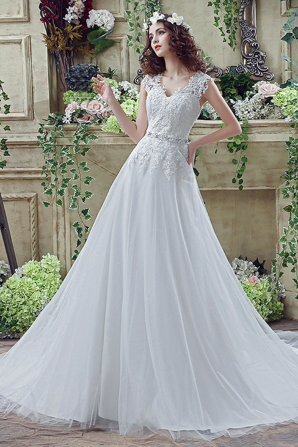 princess white wedding dress, a-line white wedding dress, long white wedding dress.