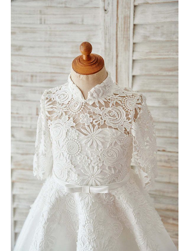 Elegant Ball Gown Long Sleeve High Neck Flower Girl Dress with Lace Tulle Bows and Sash Ribbon