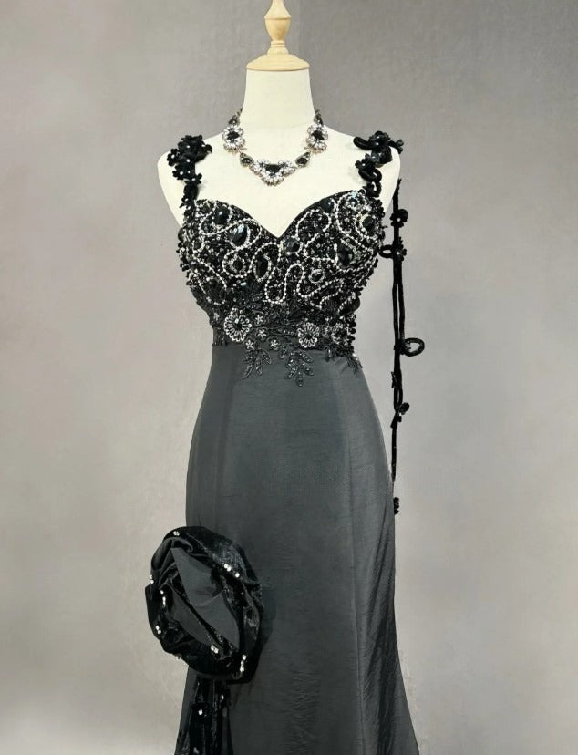 Elegant Black Mermaid Satin Beaded Sequin Long Prom Dress, Sweetheart Neck Evening Dress ED01606