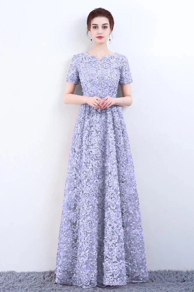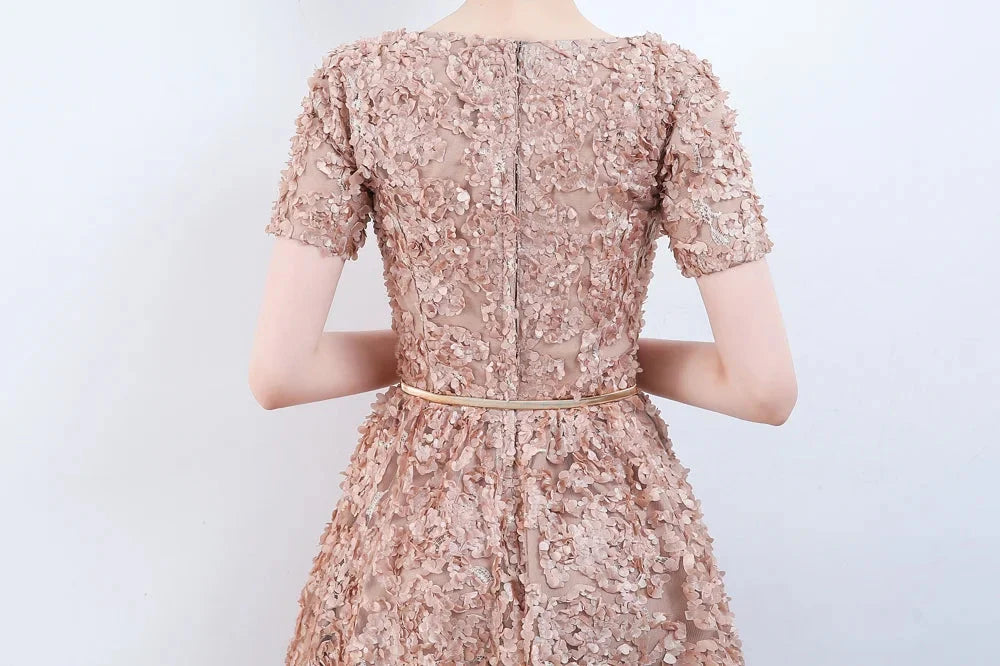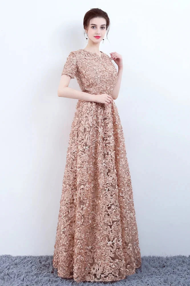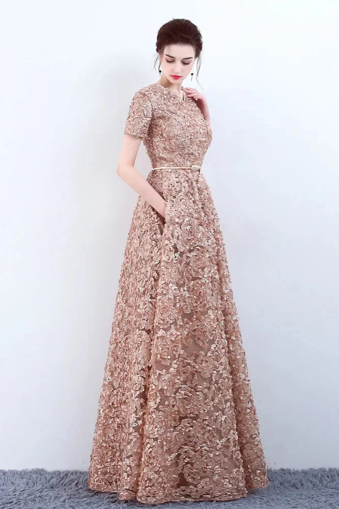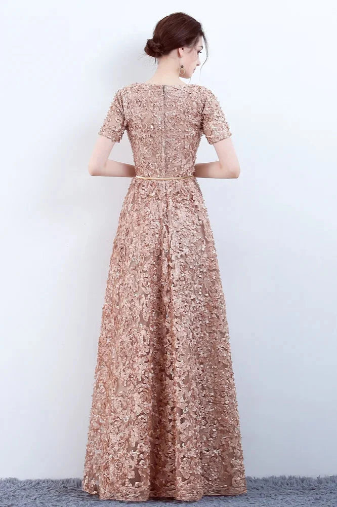 Elegant Short Or Long Sleeves Lace Evening Gowns Online Zipper Back With Belt