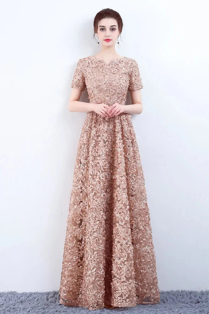 Pink Sweetheart Short Sleeves Long A-line Prom Dress, Pink Evening Gowns - Pink