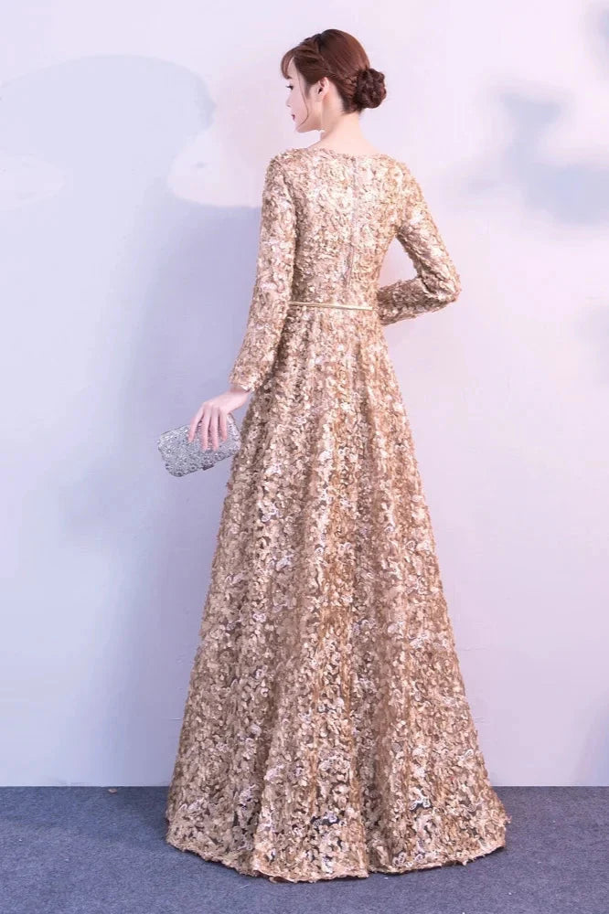 Origin: CN(Origin) Sleeve Length(cm): Full Train: Sweep Train Dresses Length: Floor-Length Actual Images: No Item Type: Prom Dresses Sleeve Style: Regular Fabric Type: Sequin Built-in Bra: Yes is_customized: Yes Decoration: Appliques Decoration: Sequined Fashion Element: Simple Waistline: Natural Factors Occasion: Prom Material: Polyester Silhouette: Trumpet / Mermaid