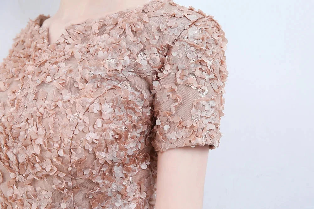 Style: ElegantSilhouette: Sheath / ColumnHemline / Train: Knee LengthNeckline: Jewel NeckFabric: SatinClosure: Zipper UPSleeve Length: Short SleeveEmbellishment: AppliquesTips: Colors may vary slightly due to different monitor settings, Hand Wash OnlyWrap: No