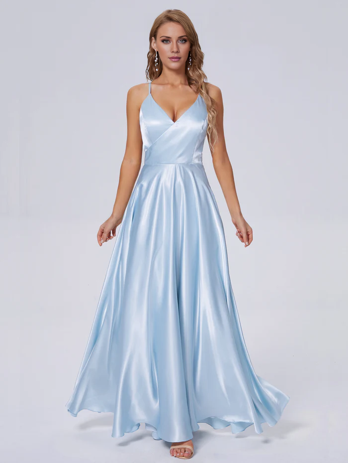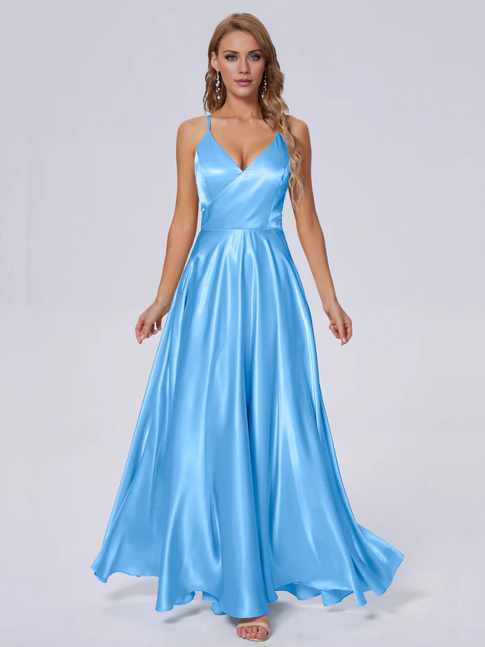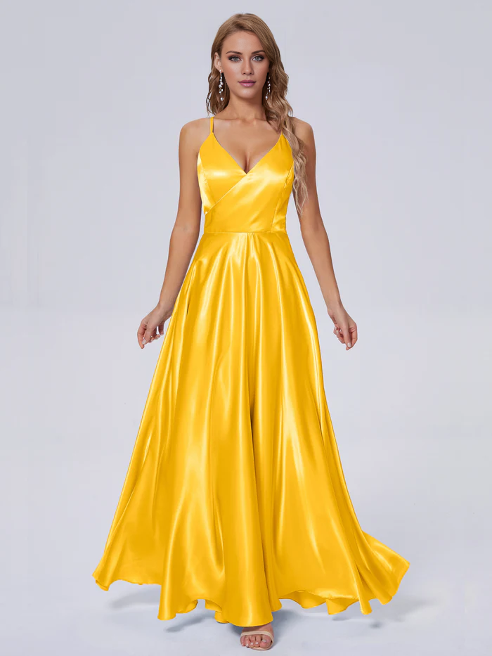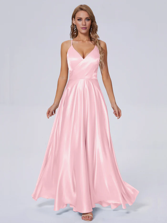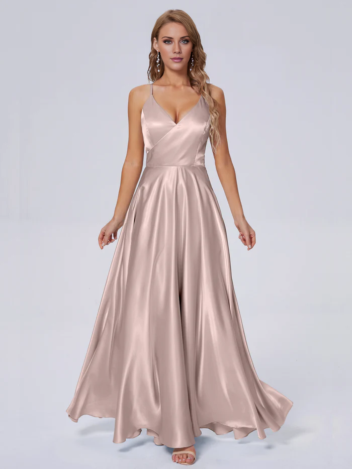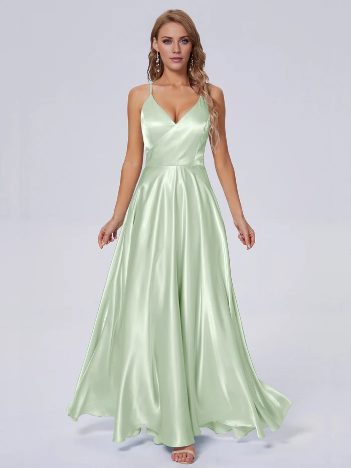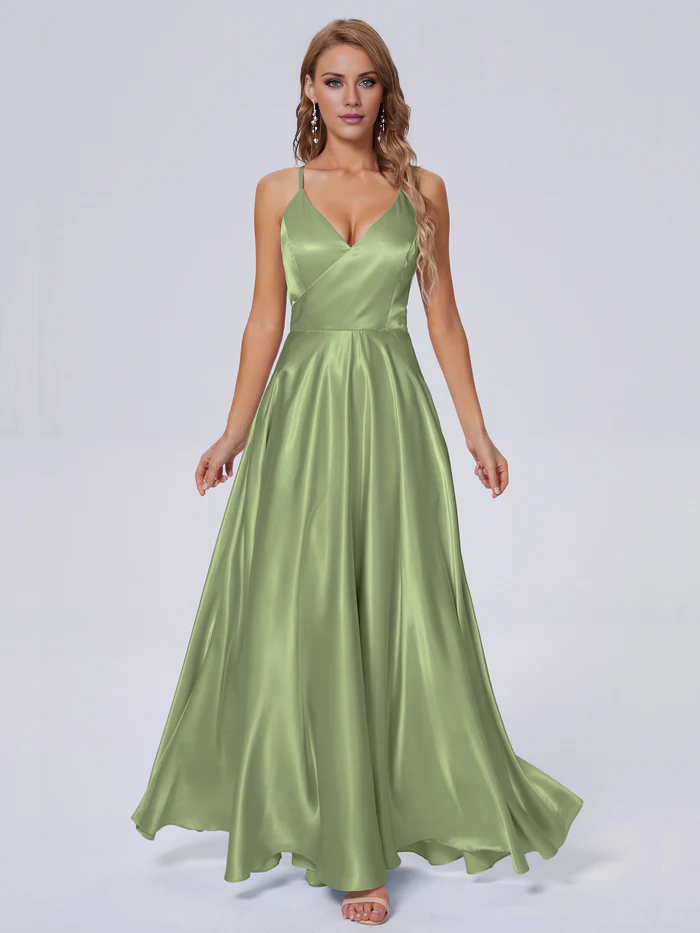 Elegant shoulder strap soft satin and floor length bridesmaid dress