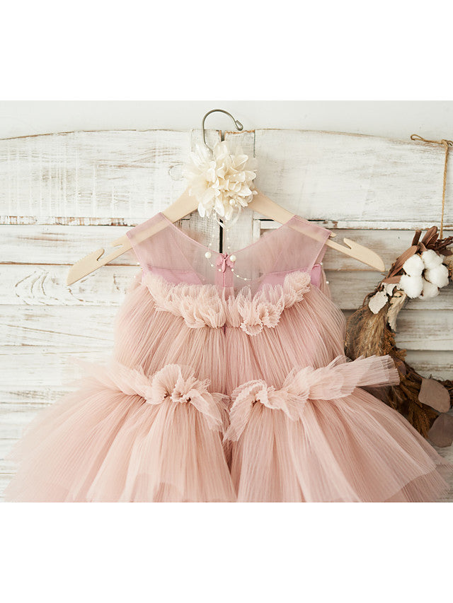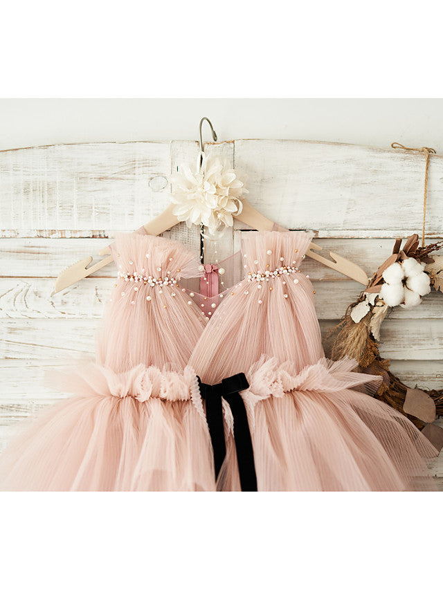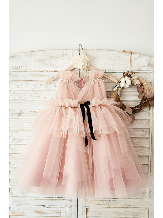 Elegant Sleeveless V Neck Ball Gown Knee Length Flower Girl Dress with Tulle and Pearls Belt