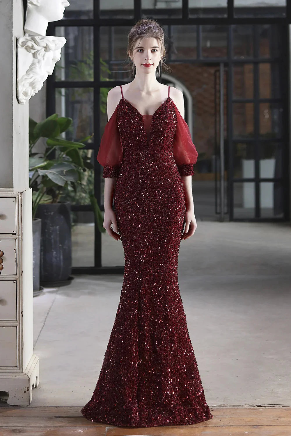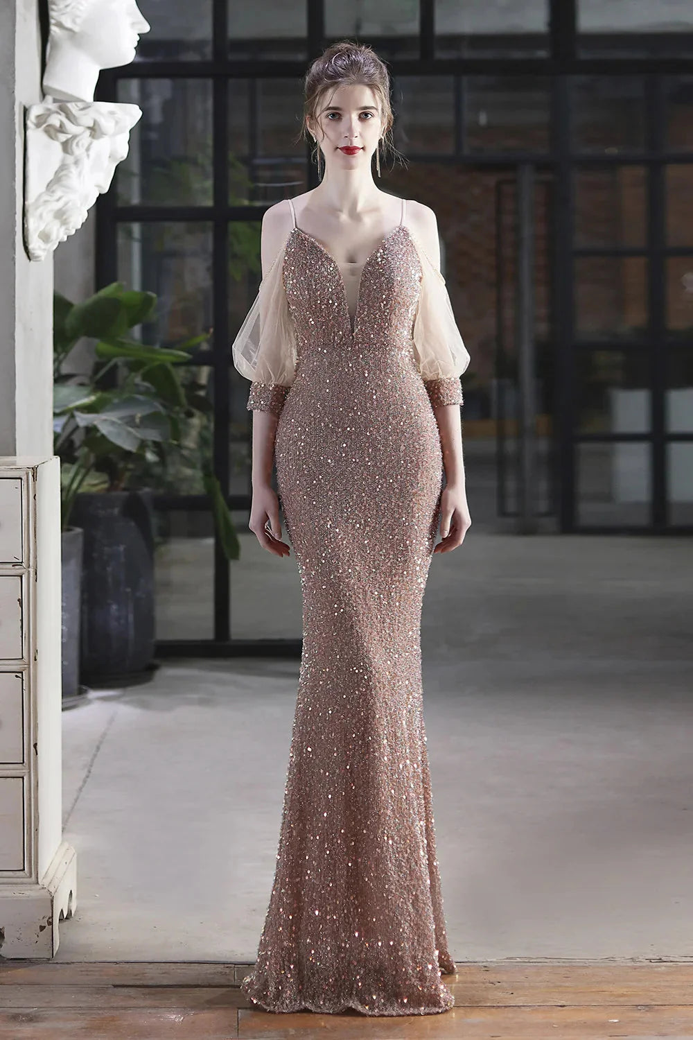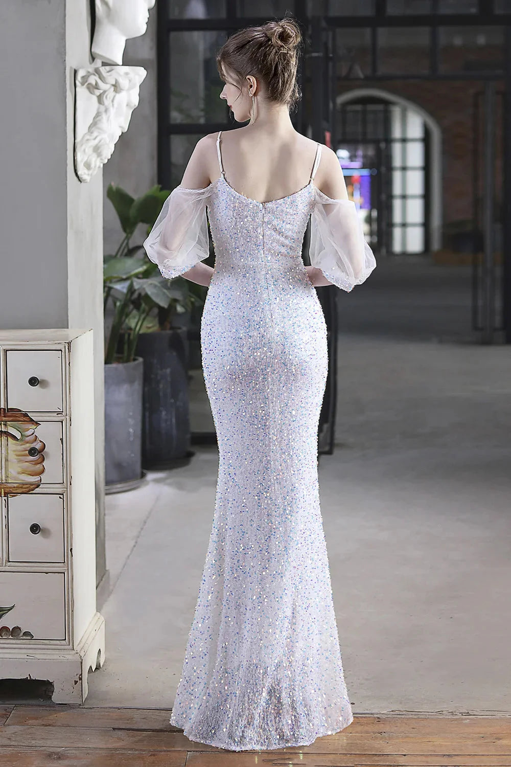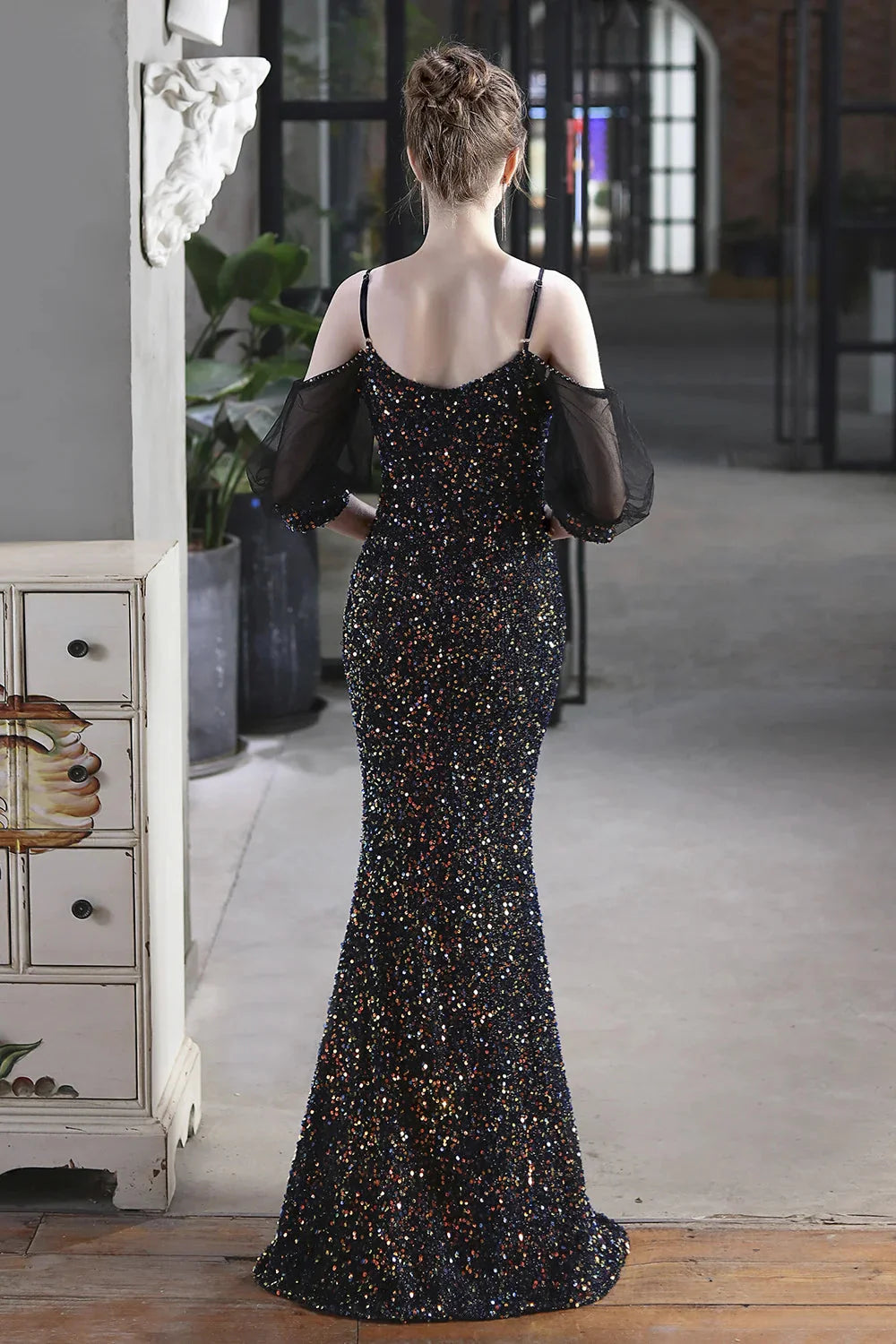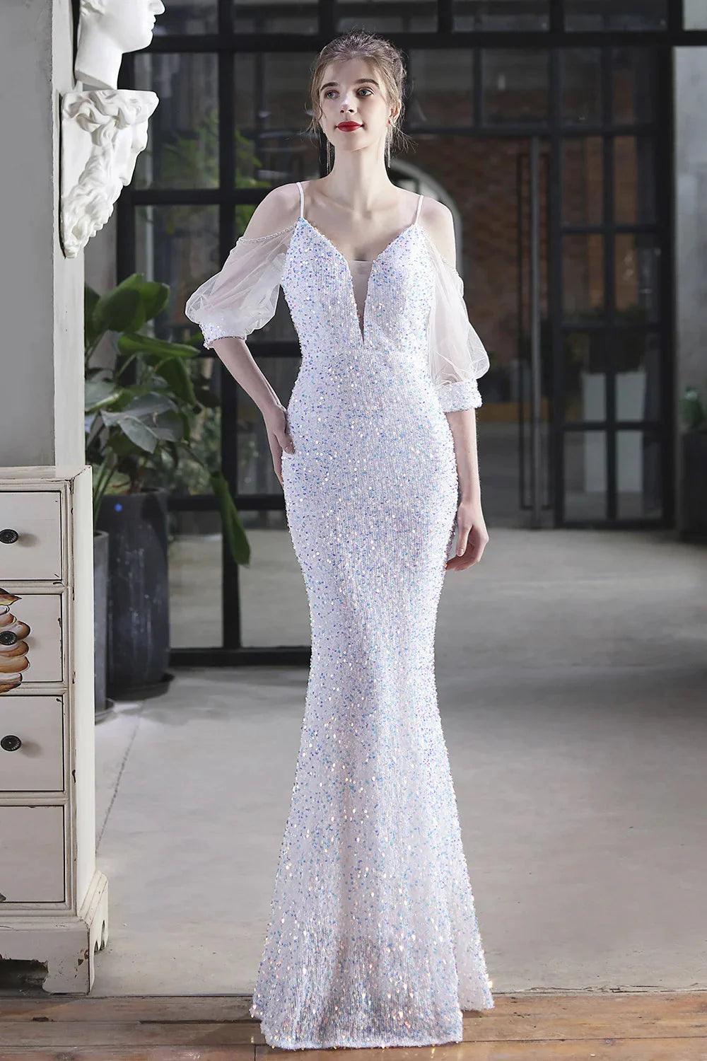 Elegant Spaghetti-Straps V-Neck Sequined Evening Formal Dress Mermaid With Bubble Tulle Sleeves