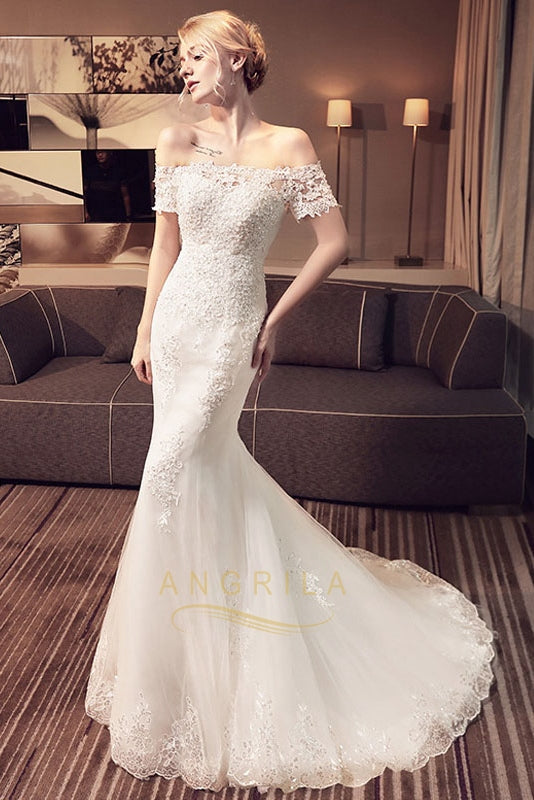 Elegant Trumpet/Mermaid Off-the-Shoulder Short Sleeves Beading Bridal Wedding Dresses