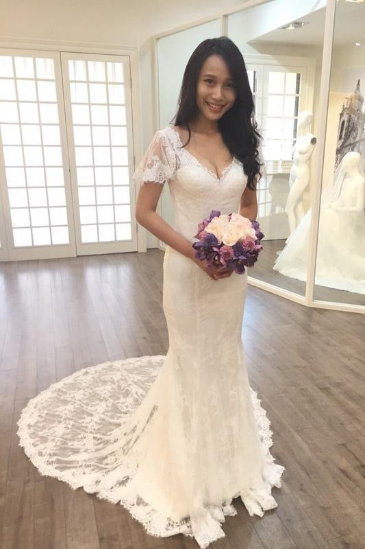 Elegant V Neck 1/4 Sleeves Sheath/Column Bridal Wedding Dresses with Lace