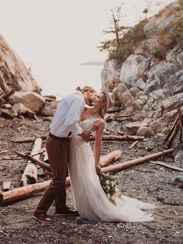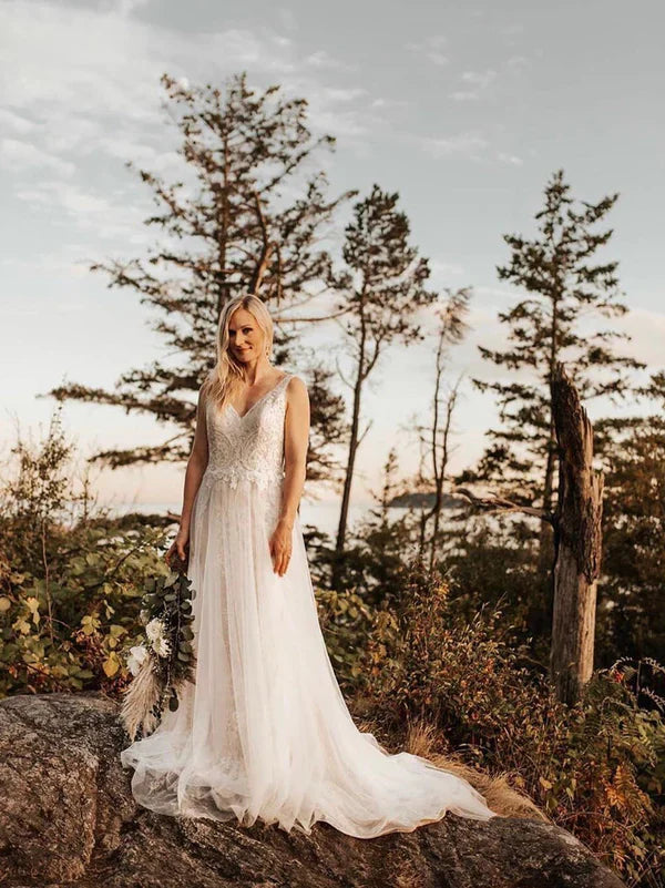 Elegant V-Neck Backless Appliques Tulle A-line Wedding Dresses