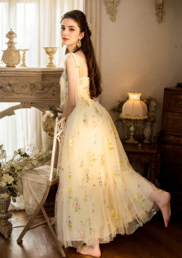 Embroidery Floral Spaghetti-straps ruched bodice tulle long prom dress