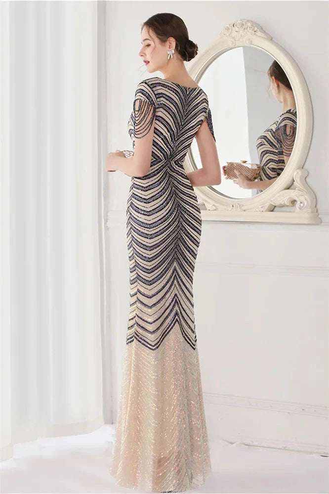 Women's Elegant Illusion Short Sleeve Crew Neck Sequin Embroidery Mermaid Evening Dresses - Gold
