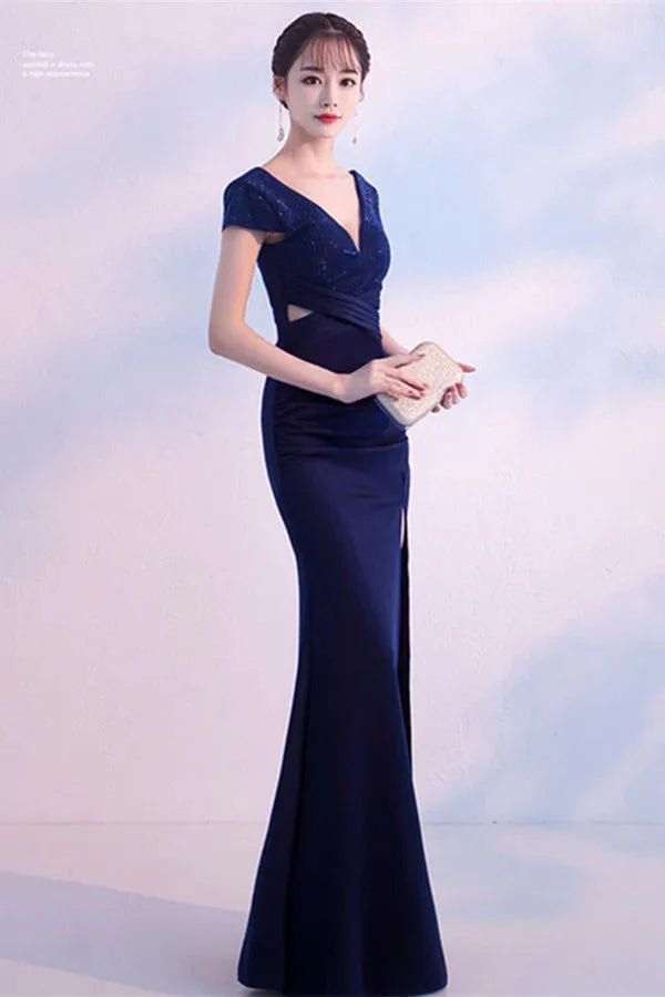 Occasion: Wedding Guest, Formal EveningStyle: Minimalist, VintageSilhouette: Sheath / ColumnHemline / Train: Floor LengthNeckline: V NeckFabric: VelvetClosure: Zipper UPSleeve Length: Long SleeveEmbellishment: Split, DrapingBuilt-In Bra: YesBoning: YesTips: Colors may vary slightly due to different monitor settings, Hand Wash Only