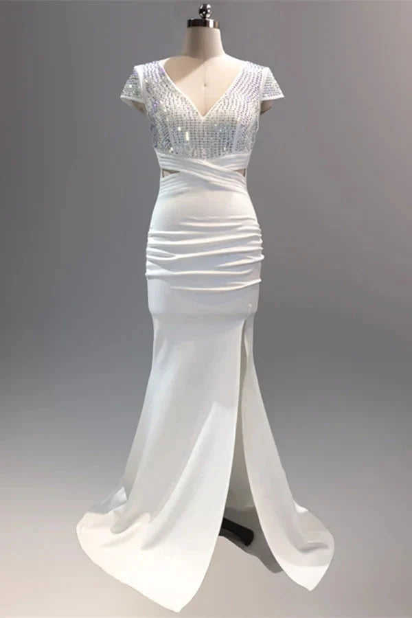 Fabulous Short Sleeves Beads Evening Dress Mermaid V-Neck With Slit