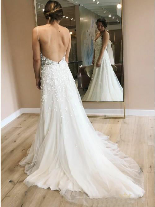 Floor-Length V-neck Spaghetti Straps Wedding Dresses