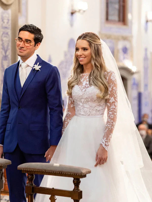 Floral Lace Illusion Long Sleeves Tulle Bridal Dress A Line Wedding Dress