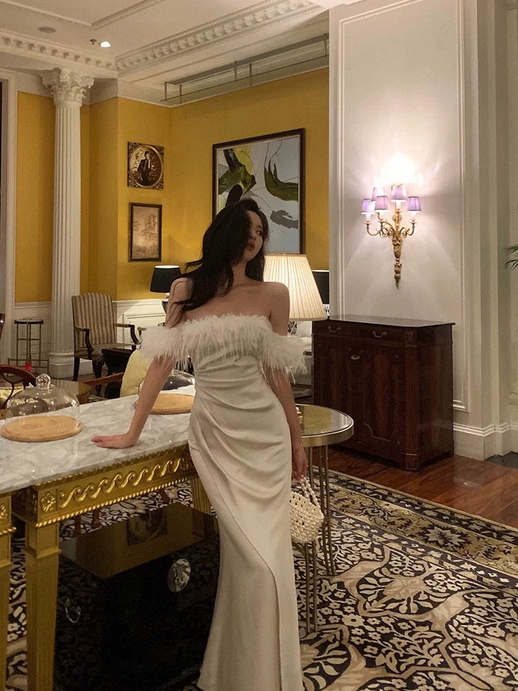 French Sheath Off The Shoulder White Satin Slit Prom Dresses Birthday Outfits SD739