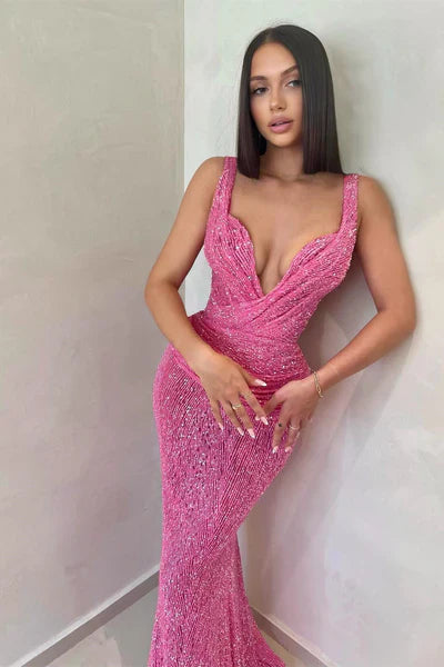 Fuchsia Pink Sleeveless V-Neck Mermaid Prom Dress Sequin